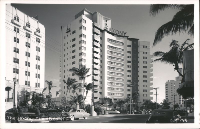 View of The Saxony hotel from the street. Cars parked along the side of the street.