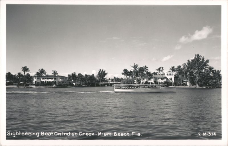 | A sightseeing boat navigates the waters of Indian Creek, passing by luxurious waterfront homes with prominent arched entrances. These residences, nestled amidst tropical foliage and palm trees, showcase the elegant architecture and scenic beauty of the area. |