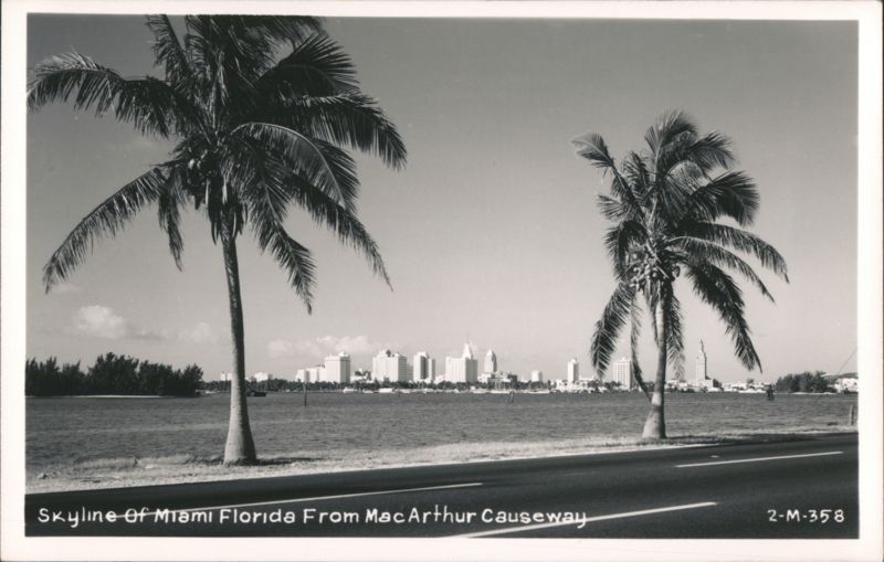 View of the Miami skyline from the MacArthur Causeway, featuring two palm trees in the foreground.