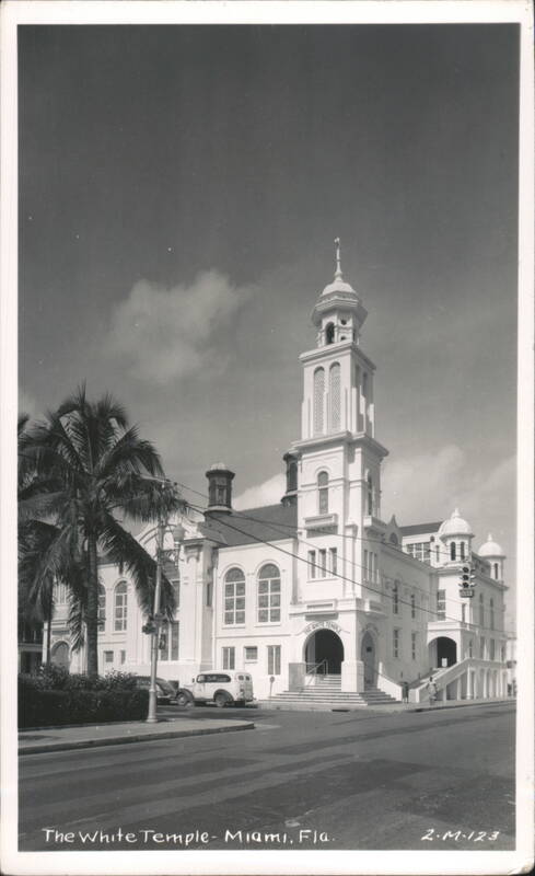 The White Temple in Miami, Florida. Cars parked in front and a person walking up the steps.