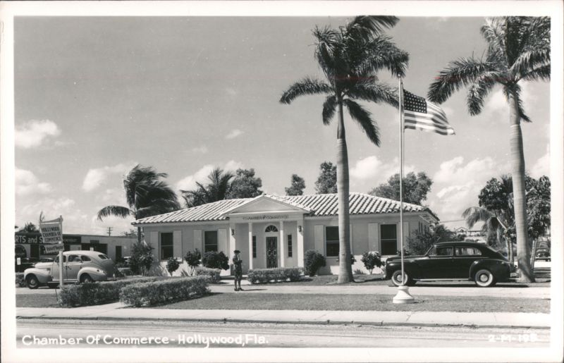 The Hollywood Chamber of Commerce building with cars parked out front and a US flag flying.