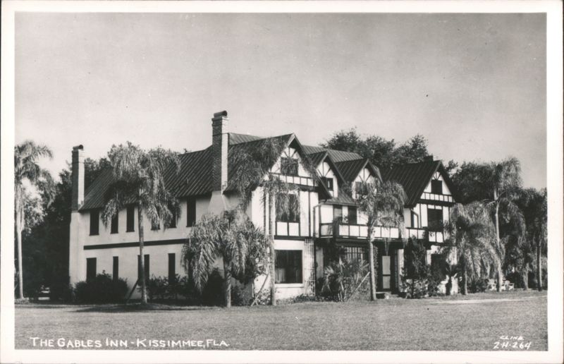 | The Gables Inn in Kissimmee, Florida, showcases its Tudor Revival architecture with decorative half-timbering and steeply pitched gables. The inn is surrounded by lush landscaping, including palm trees, creating a tropical ambiance. |