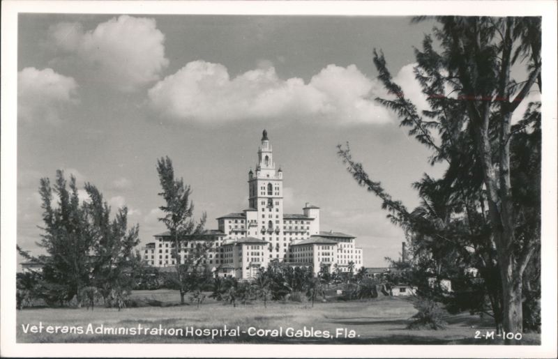 Veterans Administration Hospital in Coral Gables, Florida. The hospital is a large, white building with a tall tower. There are trees and bushes in front of the hospital, and a grassy area in the foreground.