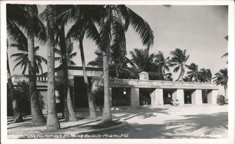 View of the bathhouse at Matheson Hammock Bathing Beach. Several people are visible near the entrance.