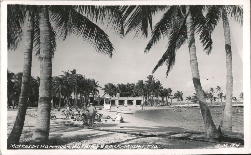 People enjoying the beach and swimming in the water at Matheson Hammock Bathing Beach.