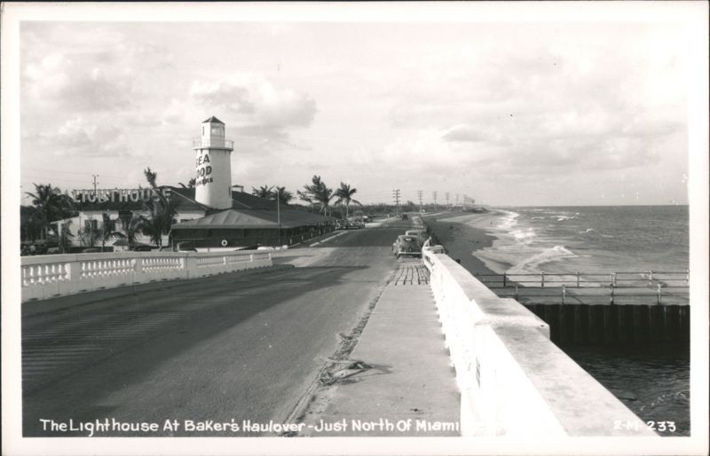 View of the Lighthouse restaurant and the beach just north of Miami. Cars are parked along the road and the ocean waves are visible in the background.