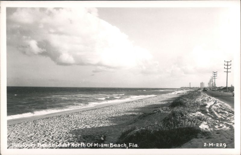 View of Haulover Beach just north of Miami Beach, Florida. The image shows the sandy beach, ocean waves, and a road with utility poles. A car can be seen driving on the road.