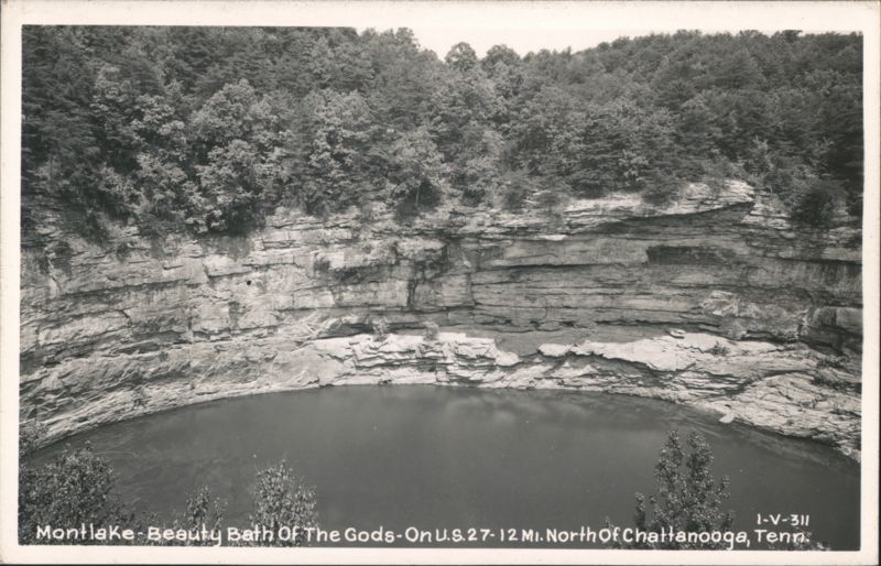 View of the rock cliffs and pool of water at the Beauty Bath of the Gods, located on U.S. Highway 27, 12 miles north of Chattanooga.