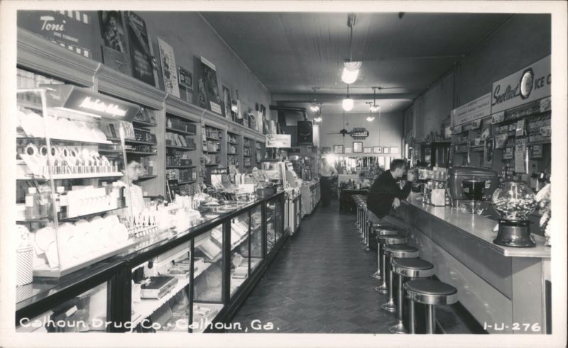 Interior view of Calhoun Drug Co. showing the soda fountain, lunch counter, and retail shelves.