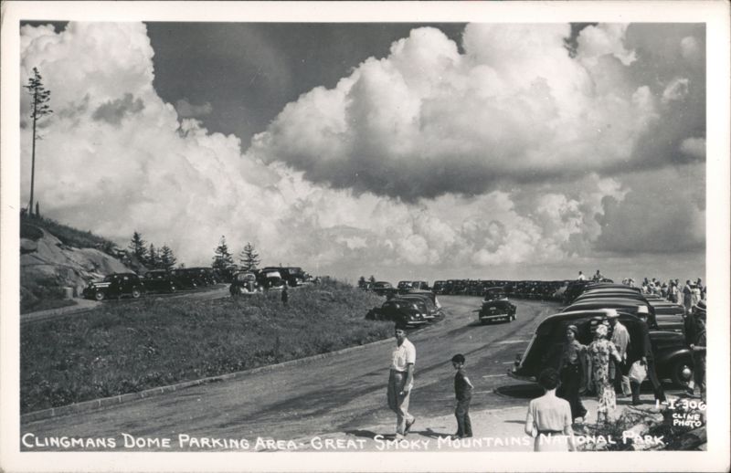 Cars parked along the road leading to the observation tower at Clingmans Dome. People are milling about, enjoying the view from the highest point in the Great Smoky Mountains National Park.