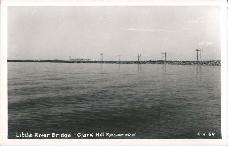 A view of the Little River Bridge spanning the Clark Hill Reservoir. Several utility poles line the shore in the background.