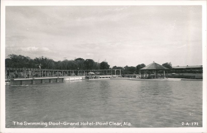 View of the swimming pool, diving board, gazebo, and hotel at the Grand Hotel in Point Clear, Alabama.