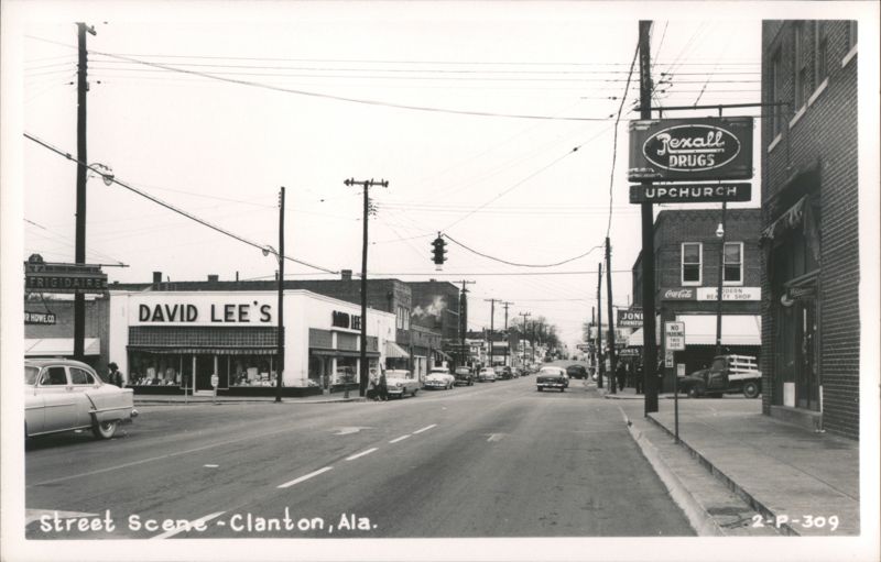 View of a street in Clanton, Alabama, featuring businesses like David Lee's, Rexall Drugs, and Joni Furniture. Cars are parked along the street, and utility poles line the sidewalks.