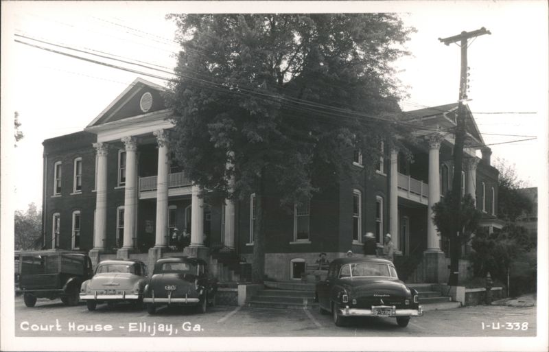 | The Gilmer County Courthouse in Ellijay, Georgia, features a classic design with prominent white columns and a central pediment. Several period automobiles are parked in front, and mature trees partially obscure the view of the building. Power lines and a utility pole are visible to the right. |