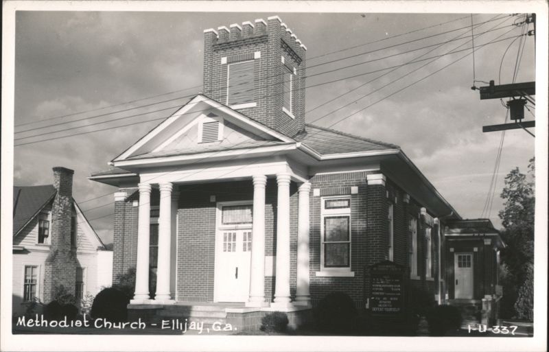 Exterior view of the Watkins Memorial Methodist Church in Ellijay, Georgia. The church features white columns, brick construction, and a crenellated tower. A sign lists the service times.