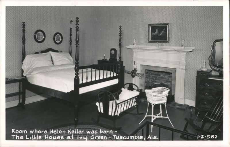 Room where Helen Keller was born at the Ivy Green house. Includes bed, cradle, fireplace, and rocking chair.