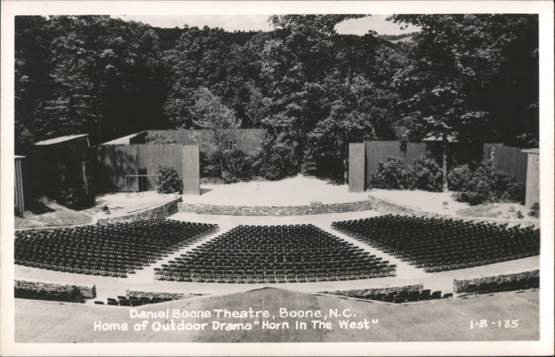 Rows of empty seats in an outdoor amphitheater, set against a backdrop of lush trees.