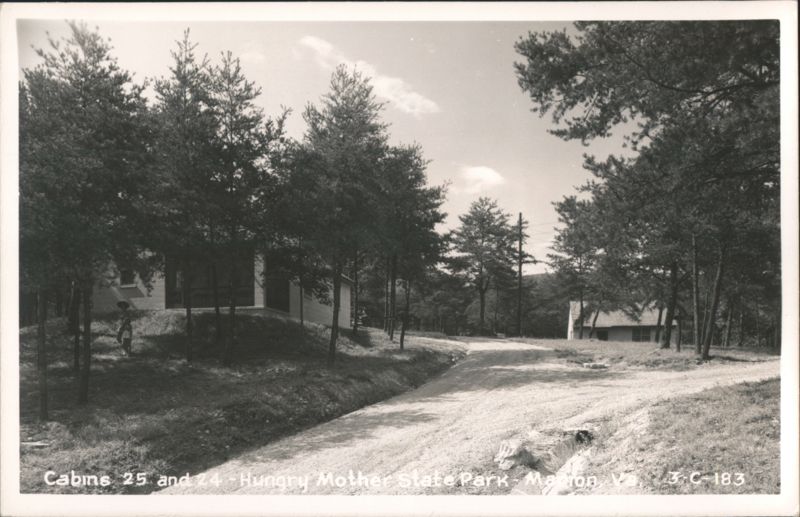 Cabins 25 and 24 at Hungry Mother State Park. A dirt road winds through the park, passing by the cabins nestled among the trees.