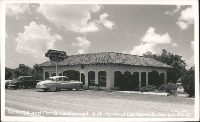 George and Fern's Restaurant located 6 miles north of Cartersville, Georgia on US Route 41. The restaurant has a Spanish style roof and arched windows.
