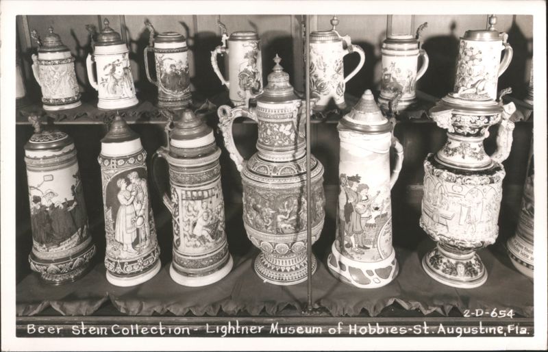 A collection of various beer steins displayed at the Lightner Museum of Hobbies in St. Augustine, Florida. The steins vary in size, shape, and decoration, showcasing different scenes and patterns.