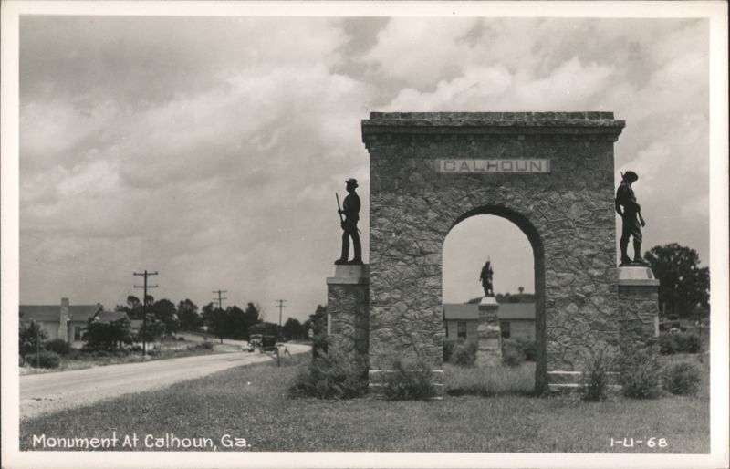 Monument with soldier statues on either side of an arch and a third soldier statue visible through the arch. A road is visible in the foreground.