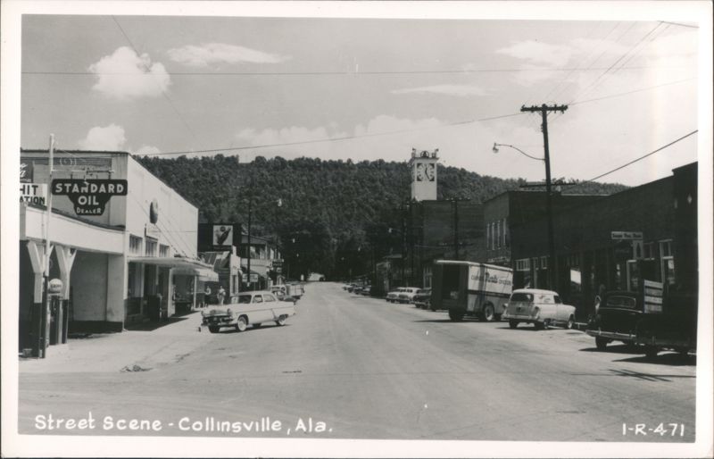 A view of a street in Collinsville, Alabama, featuring various buildings, parked cars, a clock tower, and a delivery truck.
