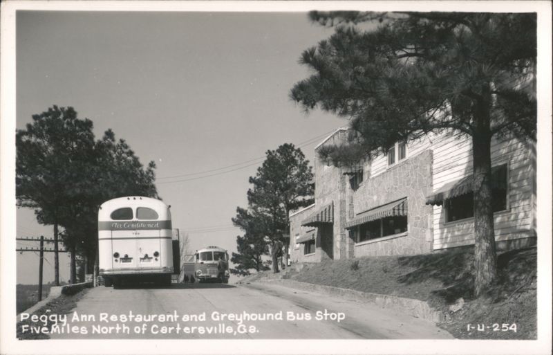 A Greyhound bus and another bus parked outside the Peggy Ann Restaurant. Five Miles North of Cartersville, GA.