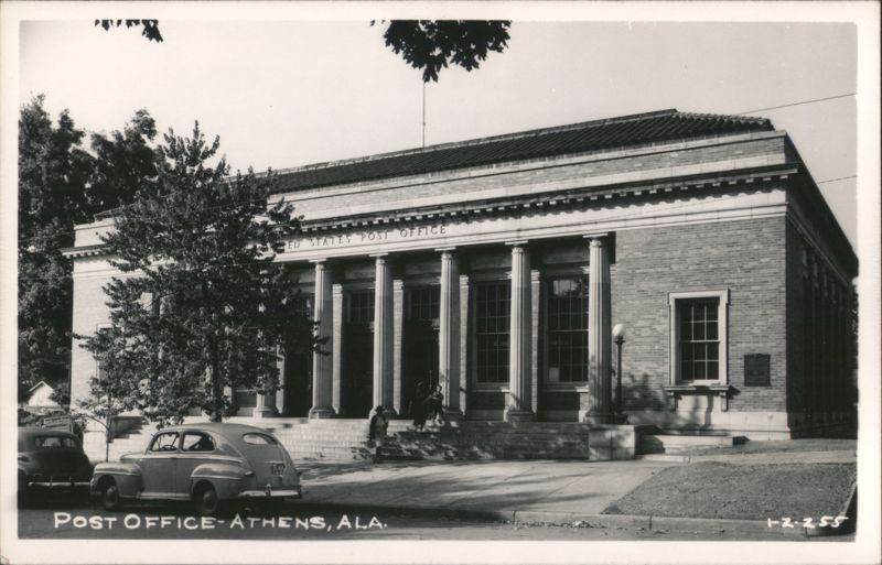 The United States Post Office in Athens, Alabama, with cars parked in front.