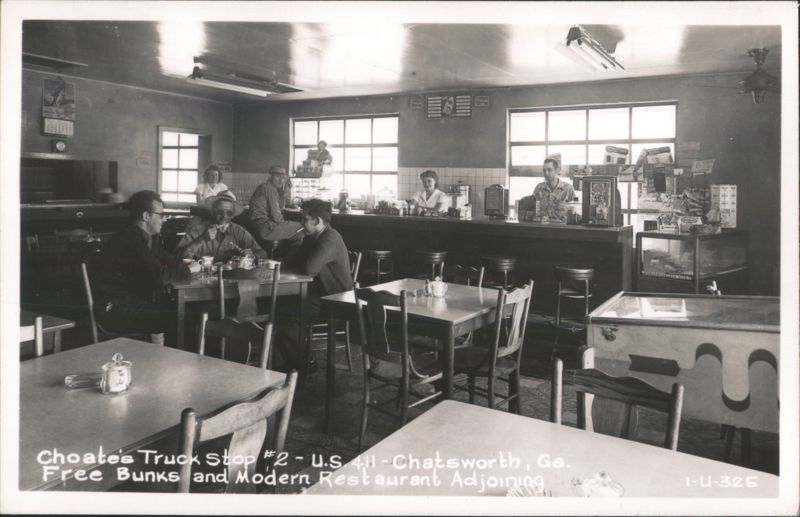 Interior view of Choate's Truck Stop #2 restaurant with patrons seated at tables and counter. Waitstaff are visible behind the counter, and a pinball machine is in the foreground.