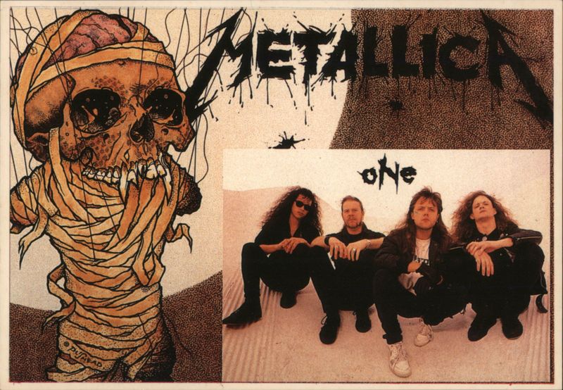 Promotional postcard for Metallica's song "One", featuring band members and artwork.