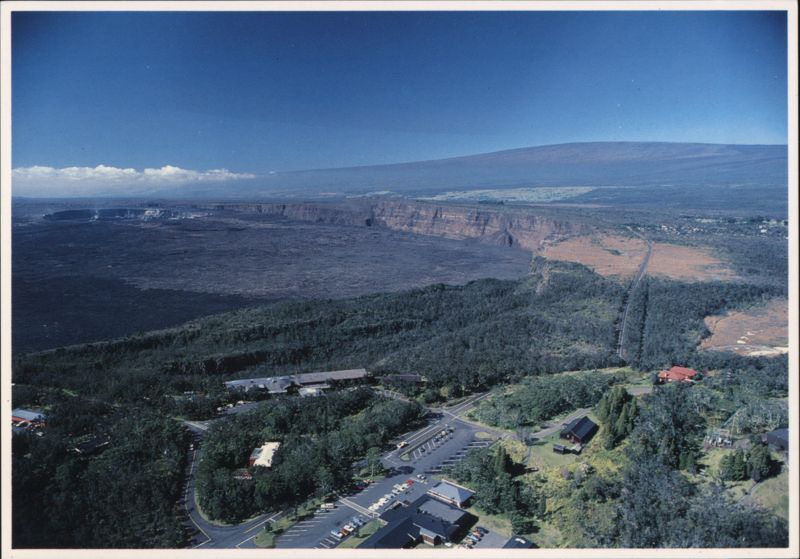 1999 Hawaiian 446 Resources, Ltd. 99704 01040' 68-309 Crozier Dr. Waialua, HI. 96791 An aerial view of the Volcano House with the expanse of Kilauea Caldera and the Hale Mau Mau fire pit beyond. Photo: Peter French
