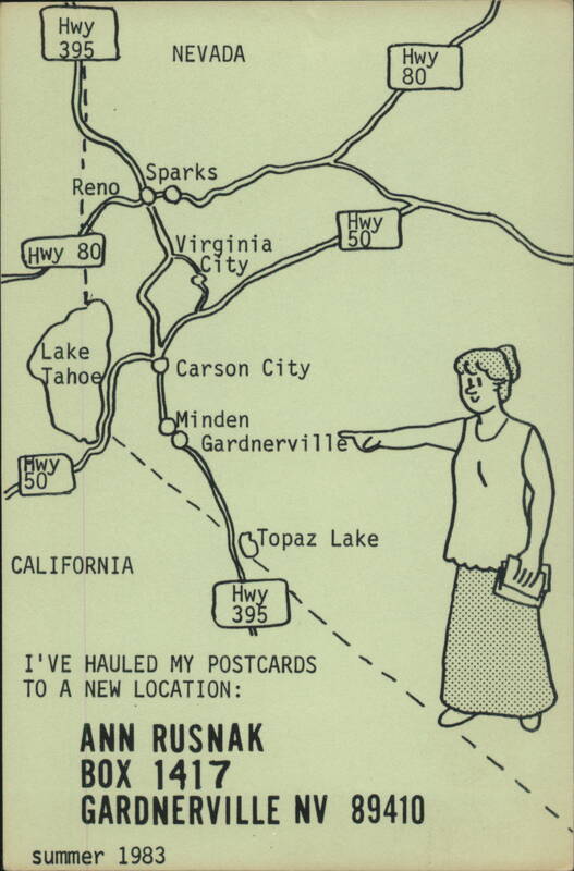 Hwy 395 NEVADA Hwy 80 Sparks Reno Hwy Hwy 80 Virginia City 50 Lake Jahoe Carson City Minden Gardnerville wy 50 CALIFORNIA Topaz Lake Hwy 395 I'VE HAULED MY POSTCARDS TO A NEW LOCATION: ANN RUSNAK BOX 1417 GARDNERVILLE NV 89410 summer 1983
