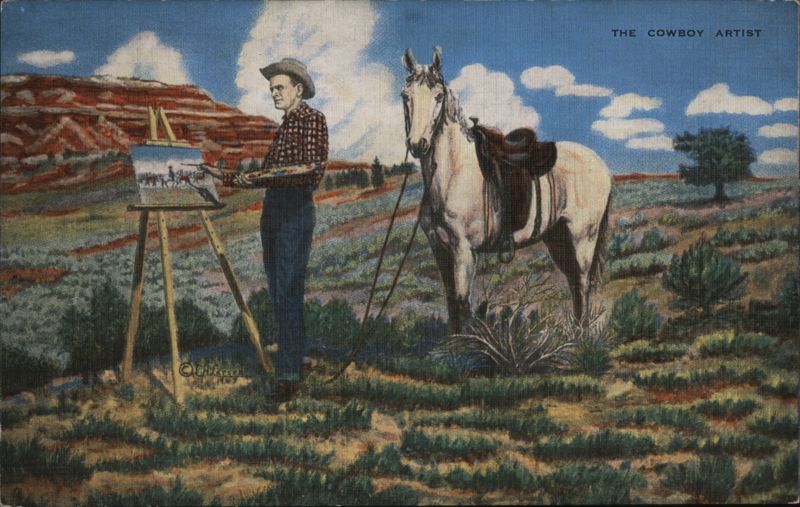 A cowboy paints a western scene with his horse standing nearby. Poem on back: Painting the west So the world may see, The free joyful life That is so dear to me. My heart does throb And my pulse run high, When I think of the land Way up in the sky. And wonder if God, Has a place set aside, With cattle and ponies That cowboys may ride. |