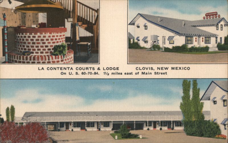 | Greetings from LA CONTENTA, THE BIG āCā for Comfort, Cleanliness and Content. 22 modern, fireproof, quiet adobe buildings. Air cooled, panel ray heat, some kitchenettes. First Court from Texas on U. S. 60-70-84. At the gateway to the Sunshine Land of Enchantment. |