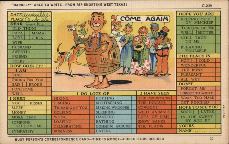 "BARRELY" ABLE TO WRITE-FROM RIP SNORTING WEST TEXAS!