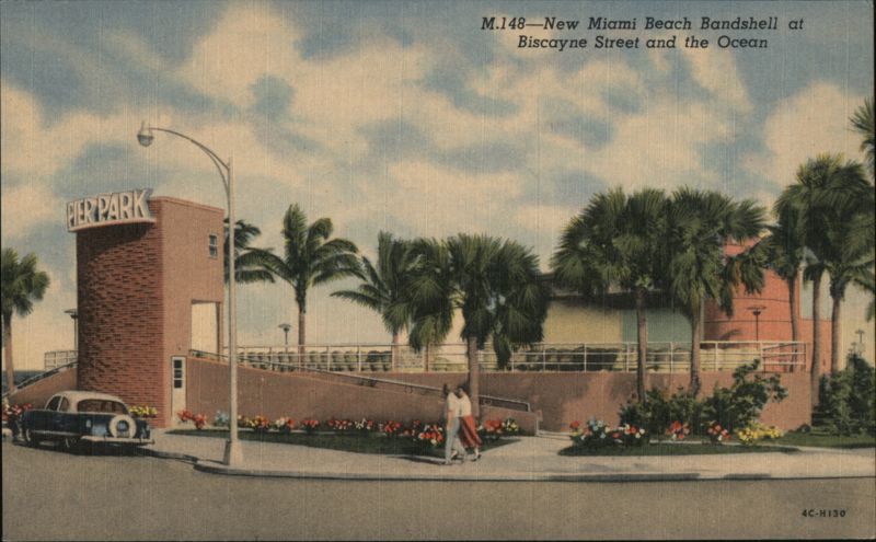 Front: PER PARK M.148-New Miami Beach Bandshell at Biscayne Street and the Ocean 4C-H130 Back: GULF STREAM CARD & DISTRIBUTING CO., MIAMI, FLORIDA GENUINE CURTEICH-CHICAGO "C.T. ART-COLORTONE'' POST CARD (REG. U.S. PAT. OFF.) PLACE