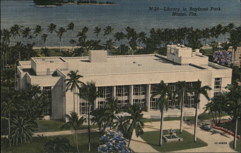 Front: M-28--Library in Bayfront Park Miami, Fla. IC-H809 Back: GULF STREAM CARD & DISTRIBUTING CO., MIAMI, FLORIDA CITY OF MIAMI NEWS BUREAU PHOTO GENUINE CURTEICH-CHICAGO "C.T. ART-COLORTONE" POST CARD (REG. U.S. PAT. OFF.) PLACE
