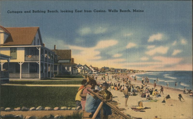 Front: Cottages and Bathing Beach, looking East from Casino, Wells Beach, Maine Back: 66127 MADE IN U. S. A TICHNOR QUALITY VIEWS" REG. U.S. PAT, OFF. MADE ONLY BY. TICHNOR BROS., INC., BOSTON, MASS.