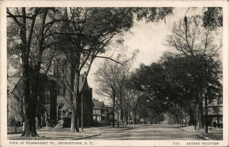 Front: VIEW OF HIGHMARKET ST., GEORGETOWN, S. C. J-10 BAYARD WOOTTEN Back: 68496 SIDE FOR MESSAGE ADVERTISING SERVICE AGENCY, CHARLESTON, S. C. HERE