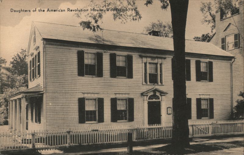 The Daughters of the American Revolution House in Woodstock, Vermont. The house is a two-story white clapboard building with black shutters and a white picket fence. The house has a plaque on the front that reads "1807". There is a tree in front of the house and a sidewalk in front of the fence. |