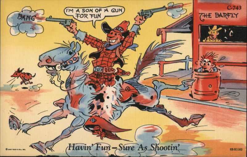 Front: BANG I'M A SON OF A GUN FOR FUN C-743 THE BARFLY 756 CUNT TEICH & CO., INC. Havin' Fun-Sure As Shootin' 6B-H1163 Back: C. T. RIDE 'EM COMICS-10 SUBJECTS GENUINE CURTEICH-CHICAGO "C.T. ART-COLORTONE'' POST CARD (REG. U.S. PAT. OFF.) HERE
