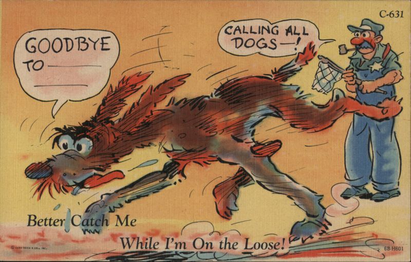Front: GOODBYE TO- CALLING ALL DOGS- Better Catch Me CURT TEICH & CO., INC. C-631 While I'm On the Loose! 6B-H601 Back: C. T. POOCH COMICS-10 SUBJECTS GENUINE CURTEICH-CHICAGO "C.T. ART-COLORTONE" POST CARD (REG. U.S. PAT. OFF.) PLACE