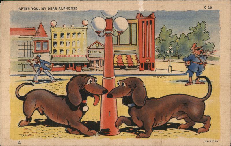 Front: AFTER YOU, MY DEAR ALPHONSE LROAA C-29 5A-H1550 Back: C. T. DOG COMICS "C.T. ART-COLORTONE" REG. U.S. PAT. OFF. MADE ONLY BY CURT TEICH & CO., INC., CHICAGO HERE