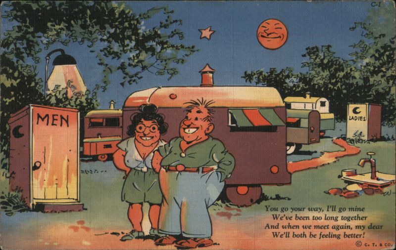 Cartoon Couple by Trailer, Outhouses, "You go your way..."