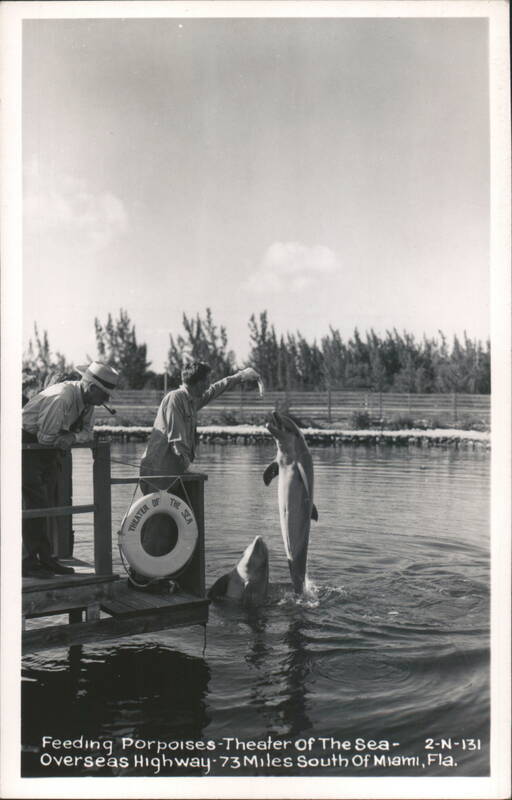 Two men on a wooden pier are feeding porpoises. One man is holding a fish, and the other is watching. A life preserver with "Theater of the Sea" written on it hangs on the pier. The porpoises are jumping out of the water to eat the fish.