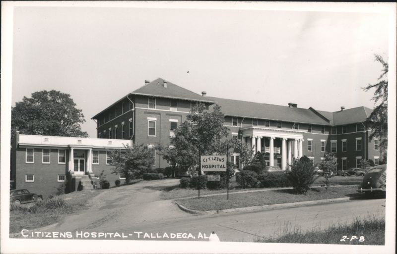 View of the Citizens Hospital in Talladega, Alabama. A sign indicates a driveway for doctors' cars only.