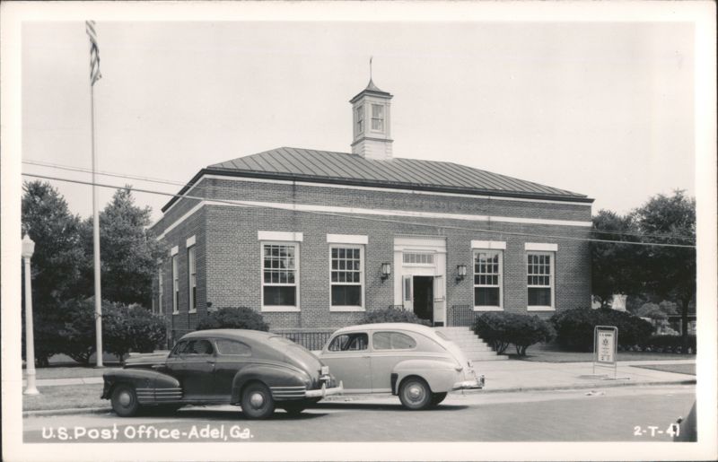 Two cars parked in front of the U.S. Post Office in Adel, Georgia. A U.S. Army recruiting sign is visible on the lawn.