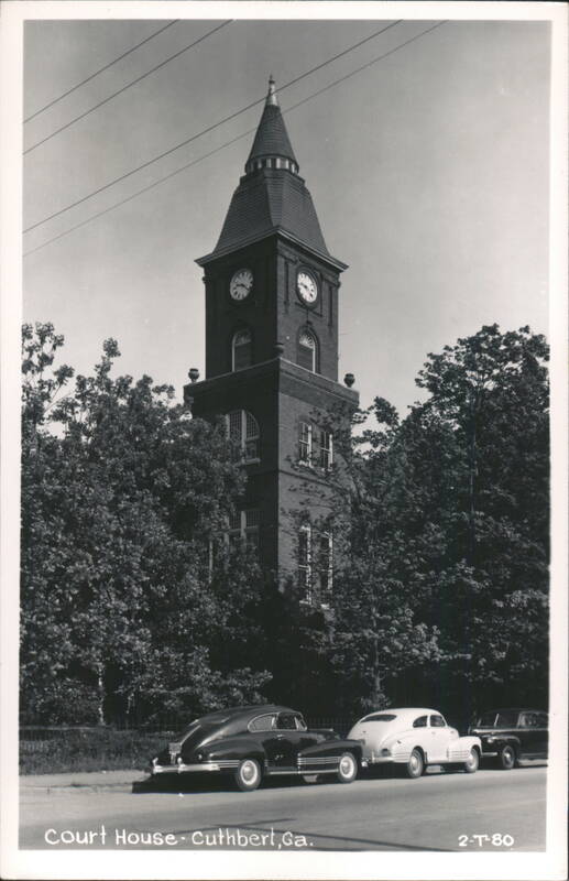 View of the Court House in Cuthbert, Georgia. Two classic cars are parked in front.