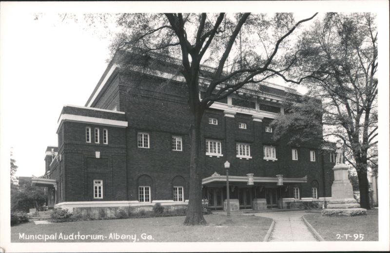 A view of the Municipal Auditorium in Albany, Georgia. A statue of a soldier stands on the right side of the image.