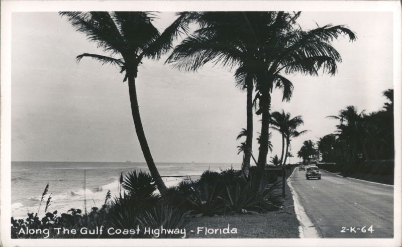 Cars driving along the Gulf Coast Highway in Florida, lined with palm trees.